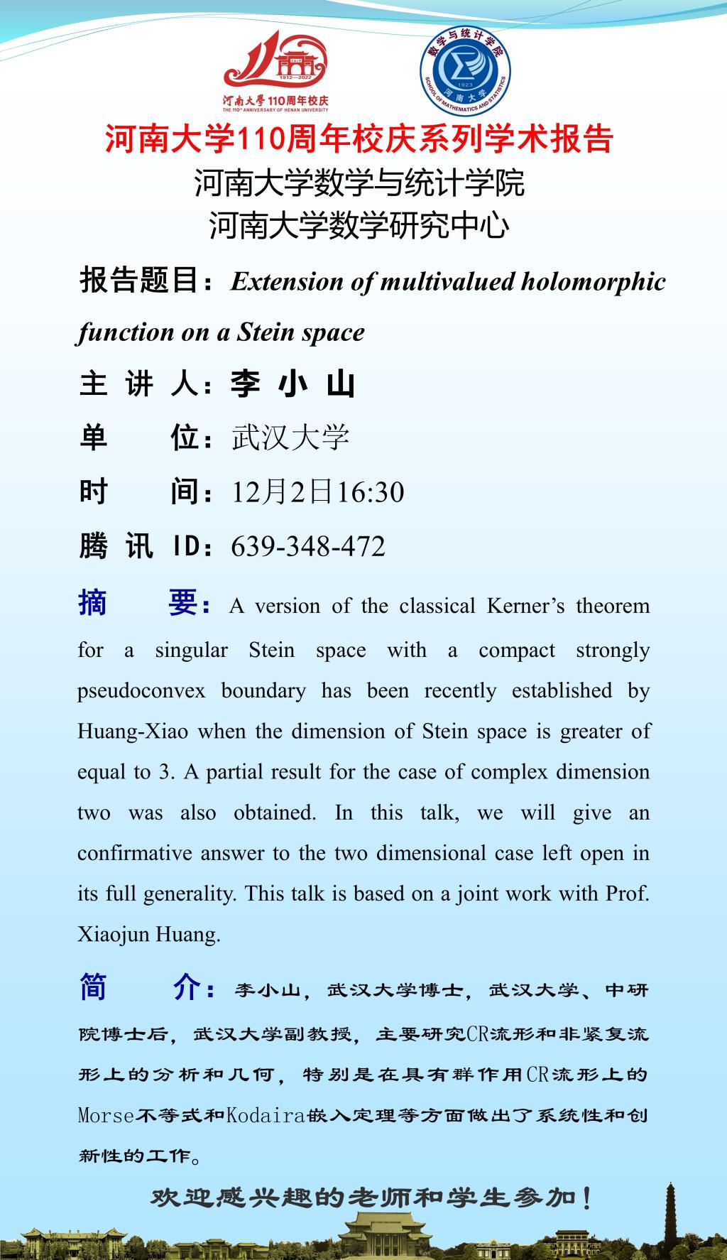 李小山:Extension of multivalued holomorphic function on a Stein space(时间:12.2)