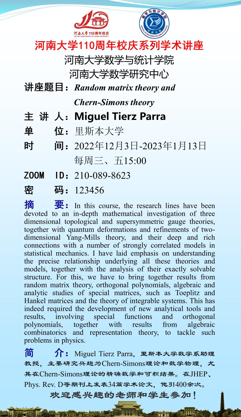 Miguel Tierz Parra:Random matrix theory and Chern-Simons theory(时间:2022年12月3日-2023年1月13日每周三、五15:00)
