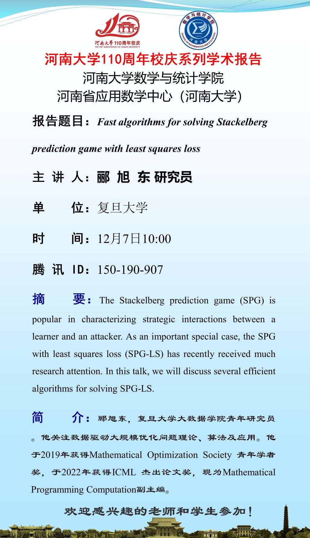 郦旭东:Fast algorithms for solving Stackelberg prediction game with least squares loss(时间:12.7)