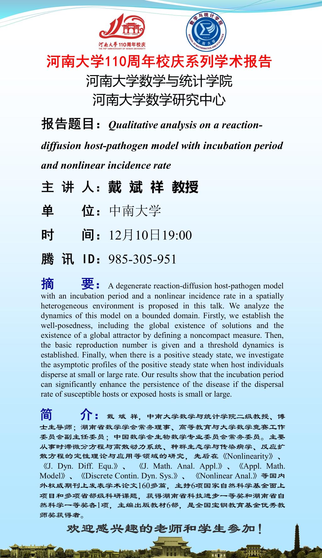 戴斌祥:Qualitative analysis on a reaction-diffusion host-pathogen model with incubation period and nonlinear incidence rate(时间:12.10)