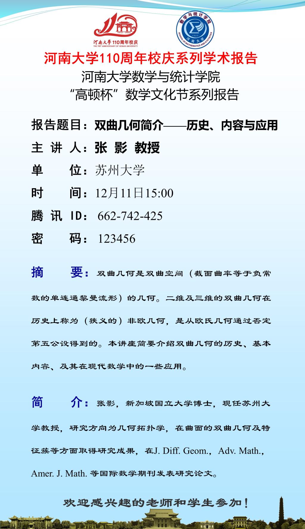 “高顿杯”数学文化节系列报告:张影:双曲几何简介——历史、内容与应用(时间:12.11)