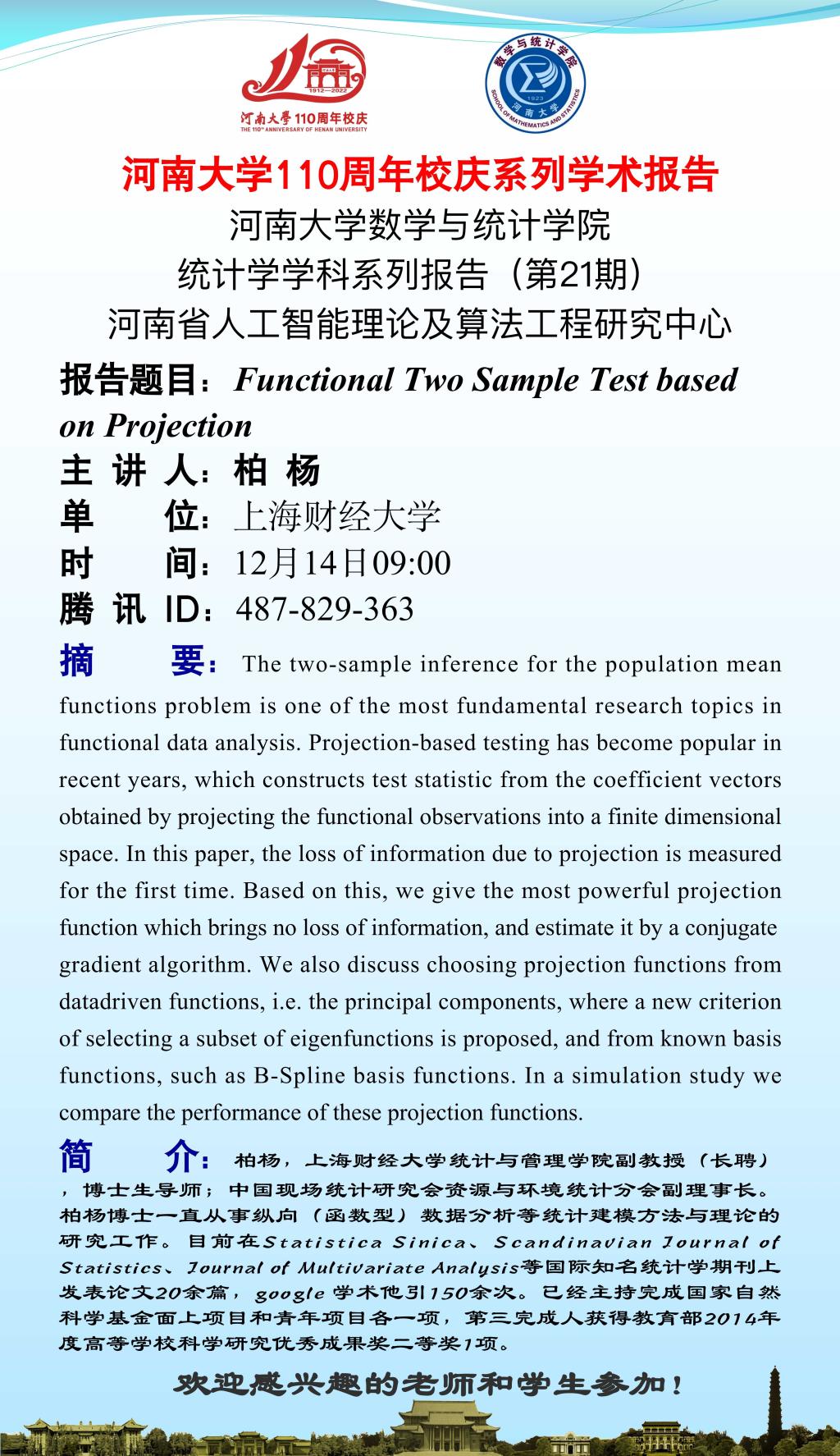柏杨:Functional Two Sample Test based on Projection(时间:12.14)