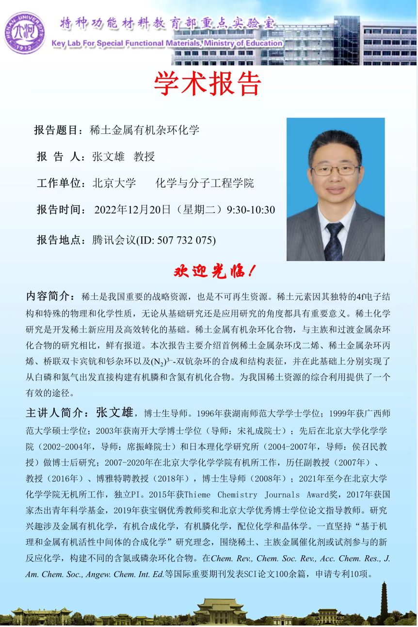 张文雄:稀土金属有机杂环化学(时间12.20)