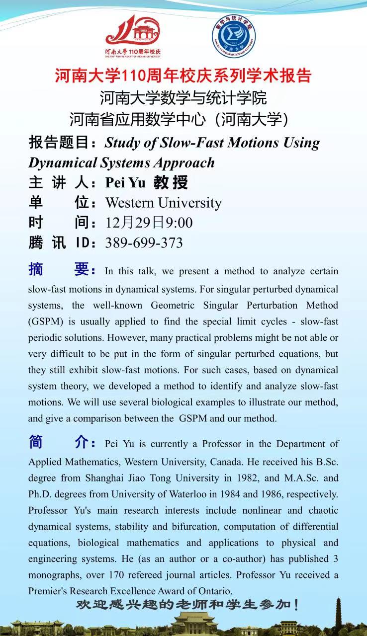 Pei Yu:Study of Slow-Fast Motions Using Dynamical Systems Approach(时间:12.29)