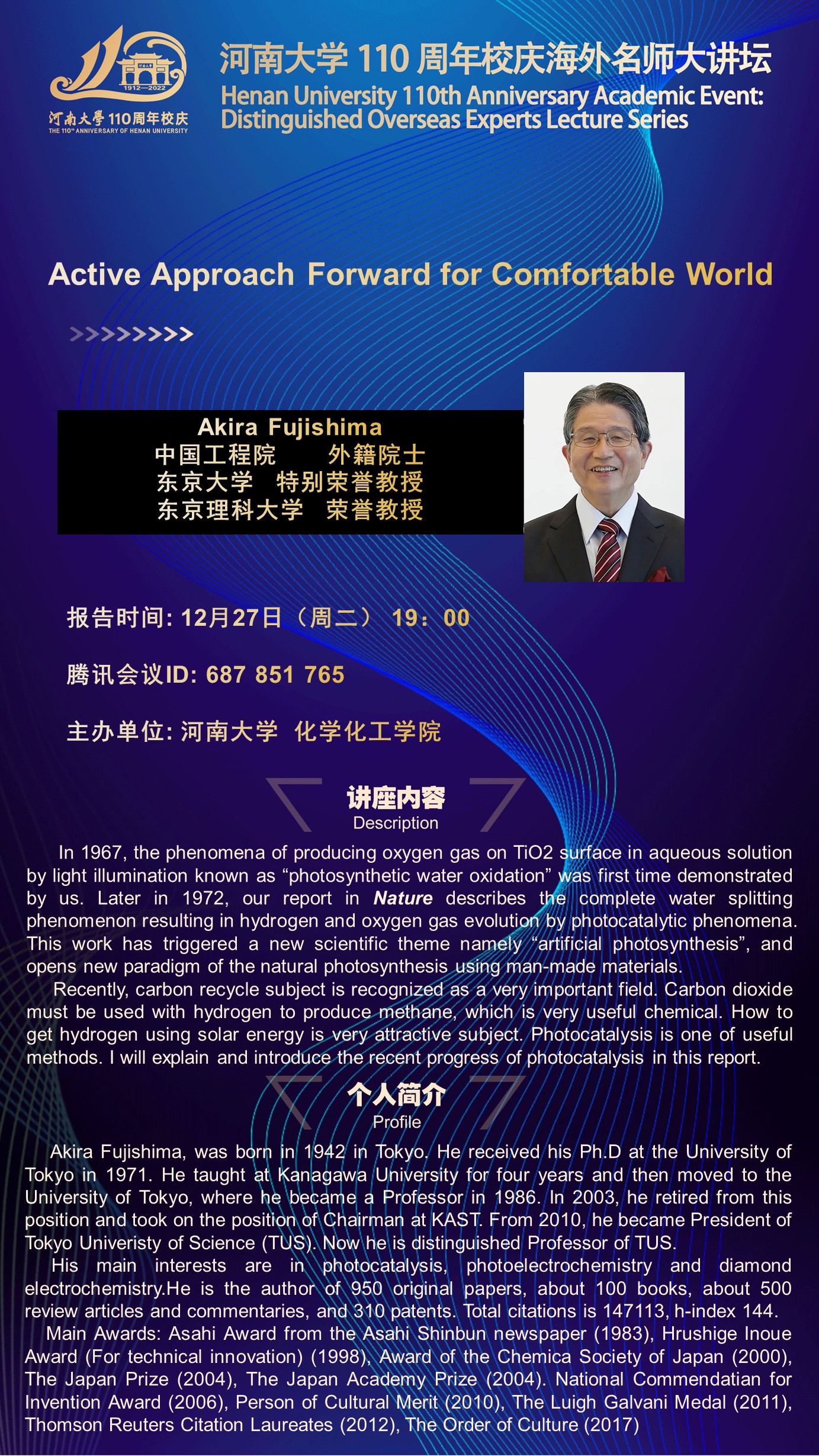 海外名师大讲坛:Akira Fujishima:Active Approach Forward for Comfortable World(时间12.27)