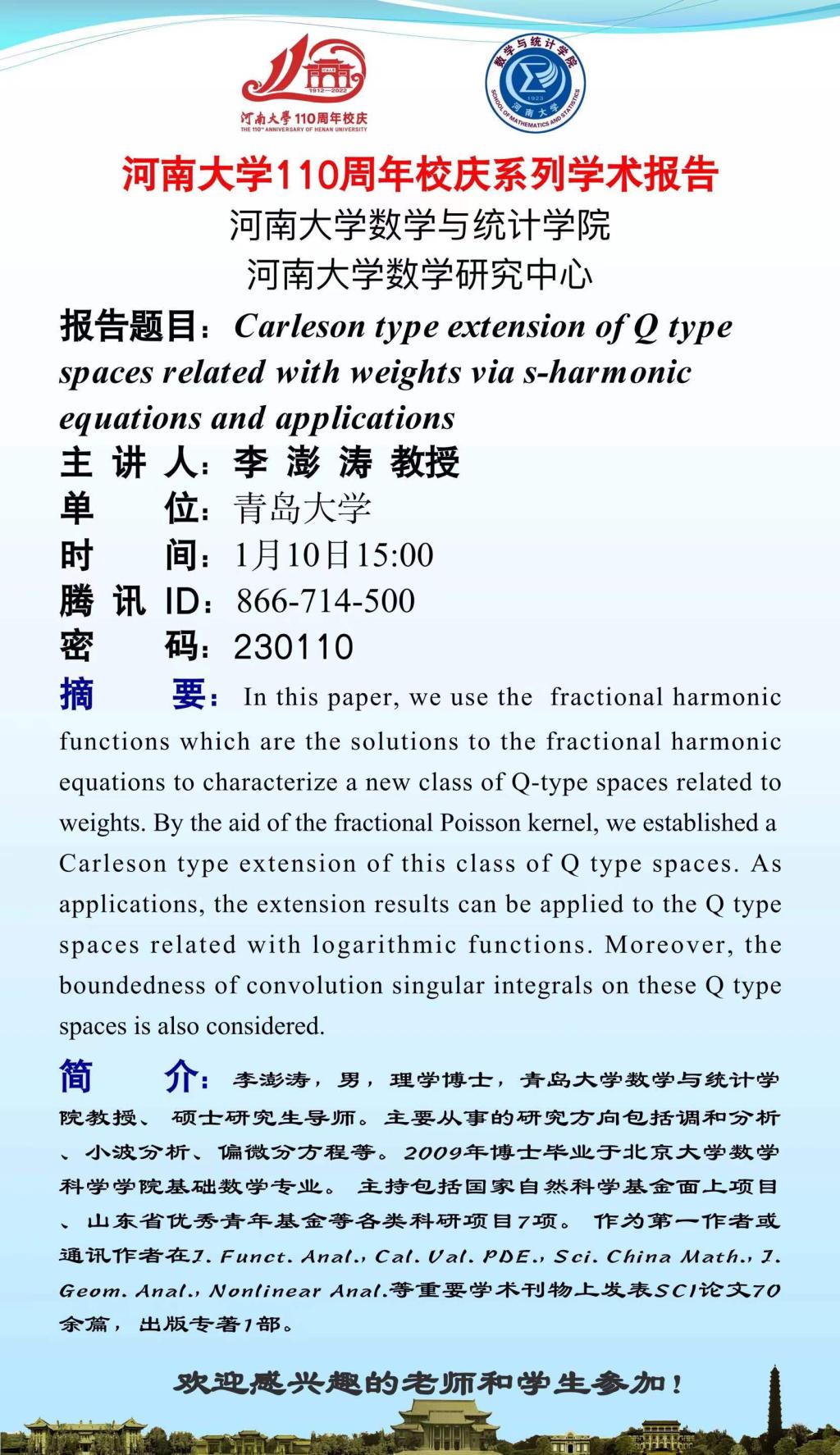 李澎涛:Carleson type extension of Q type spaces related with weights via s-harmonic equations and applications(时间:1.10)