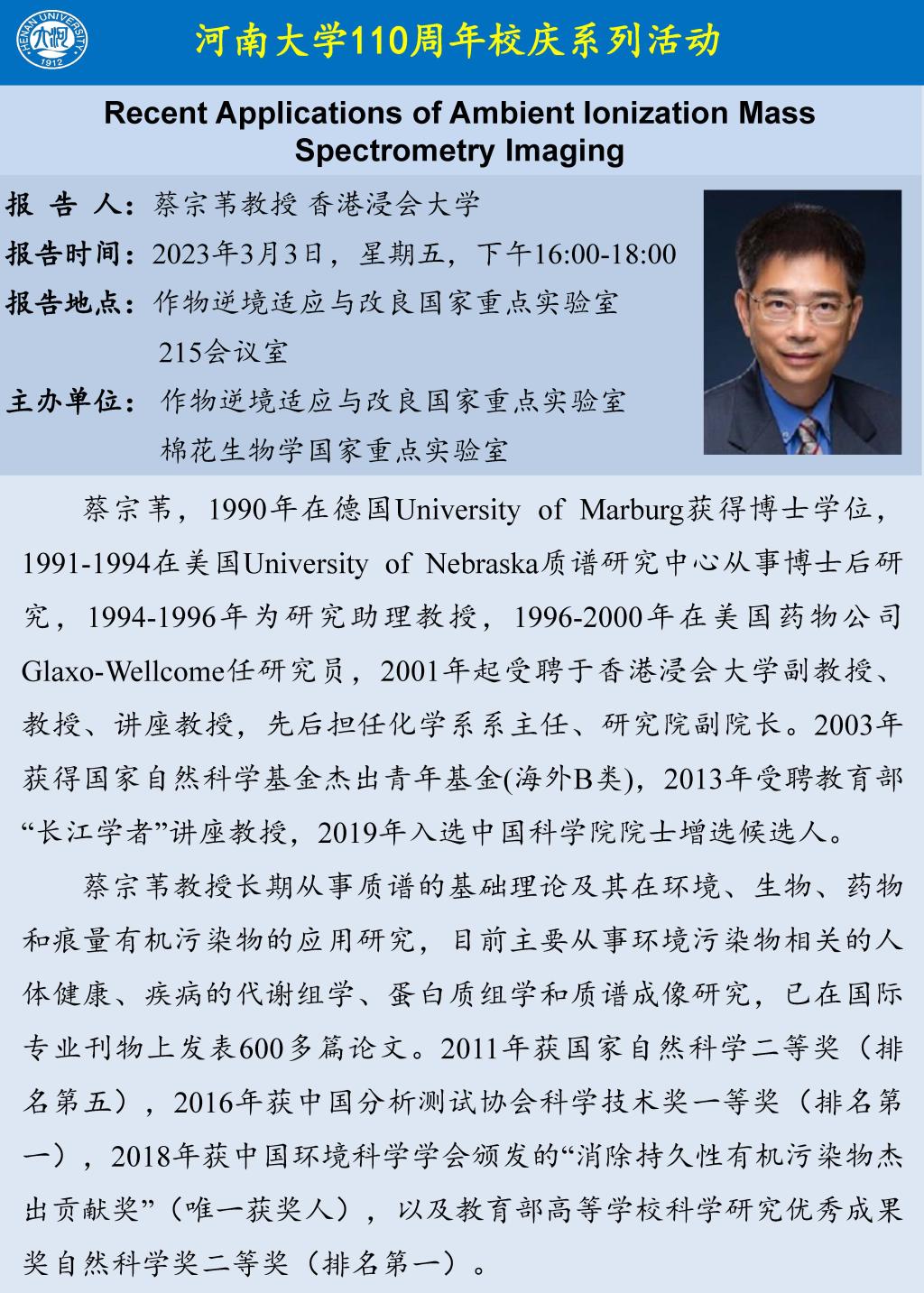 蔡宗苇:Recent Applications of Ambient Ionization Mass Spectrometry Imaging(时间3.3)