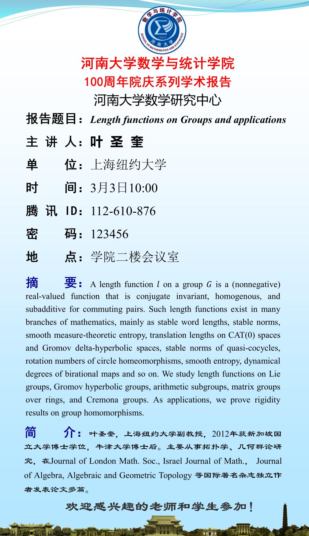 叶圣奎:Length functions on Groups and applications(时间:3.3)