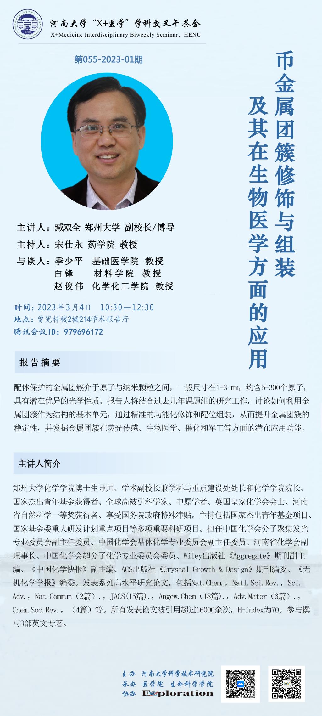 “X+医学”学科交叉午会:币金属团簇修饰与组装及其在生物医学方面的应用(时间3.4)