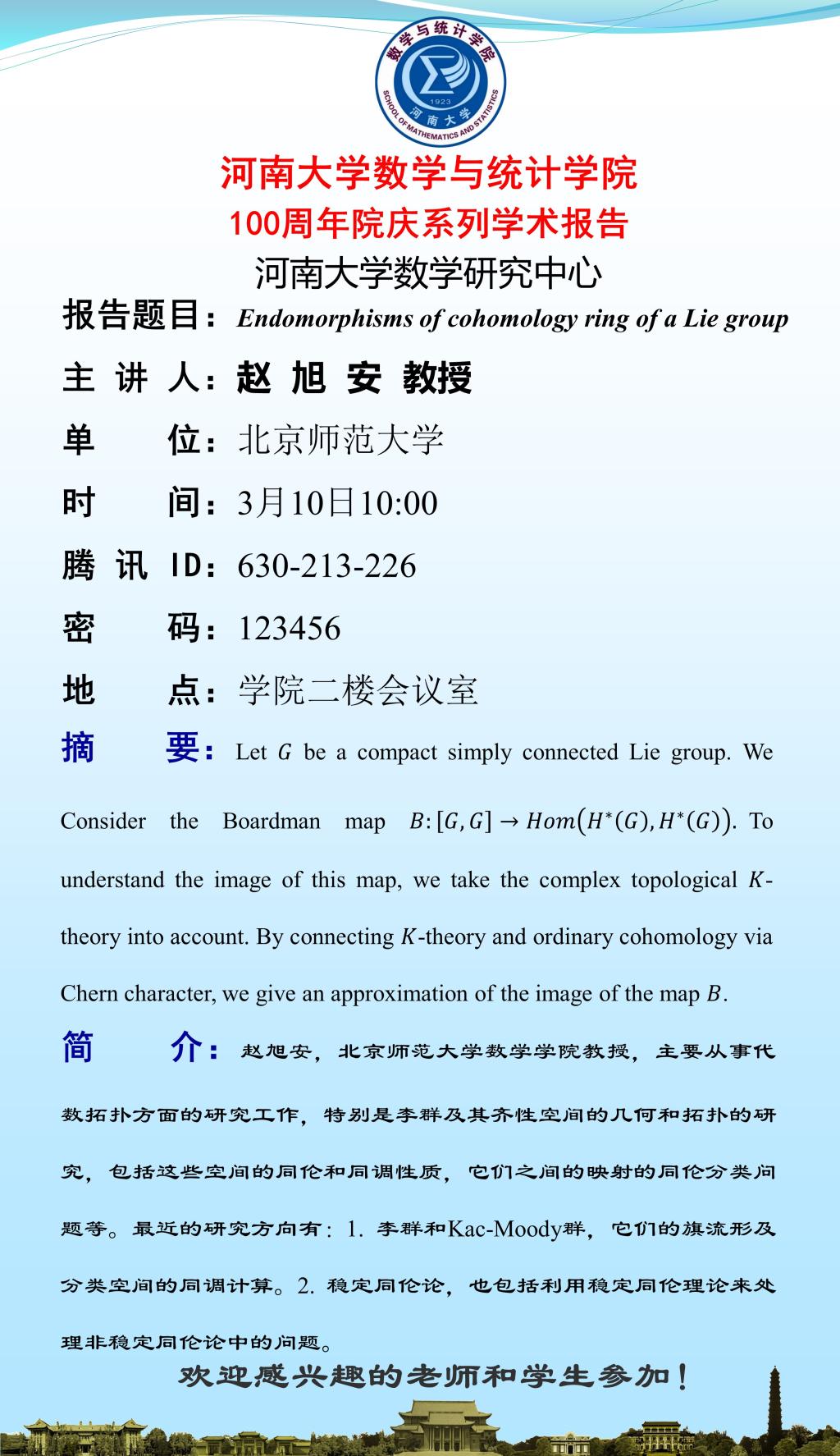 赵旭安:Endomorphisms of cohomology ring of a Lie group(时间:3.10)