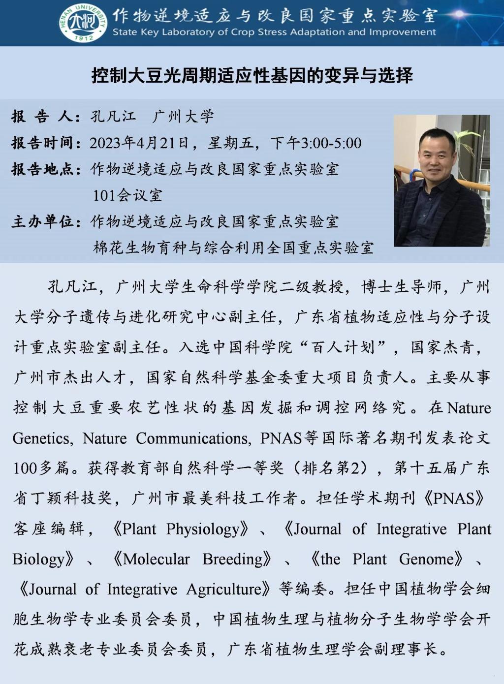 孔凡江:控制大豆光周期适应性基因的变异与选择(时间4.21)