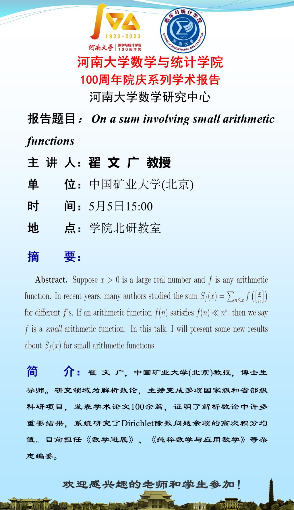 翟文广:On a sum involving small arithmetic functions(时间:5.5)