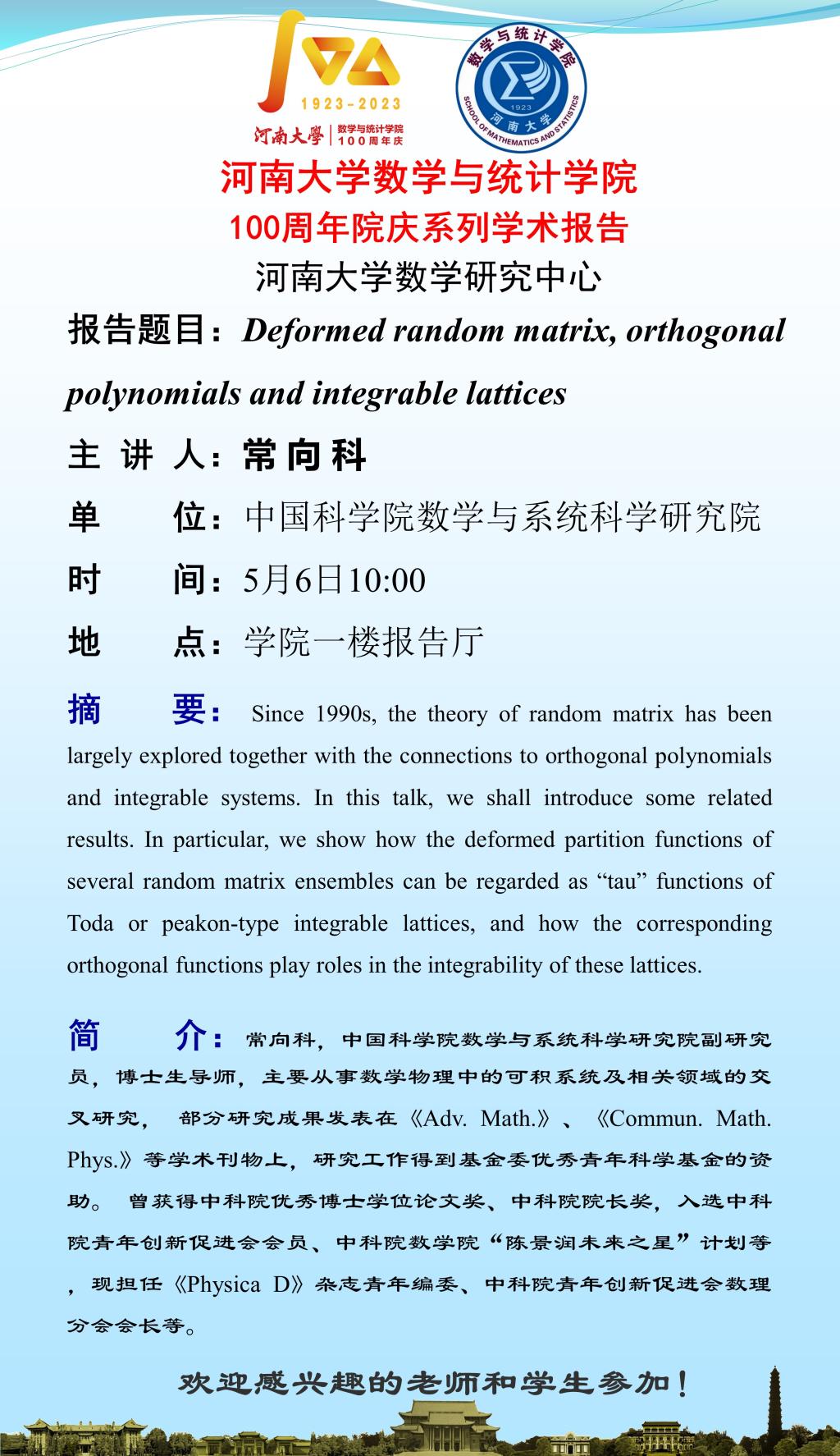 常向科:Deformed random matrix, orthogonal polynomials and integrable lattices(时间:5.6)