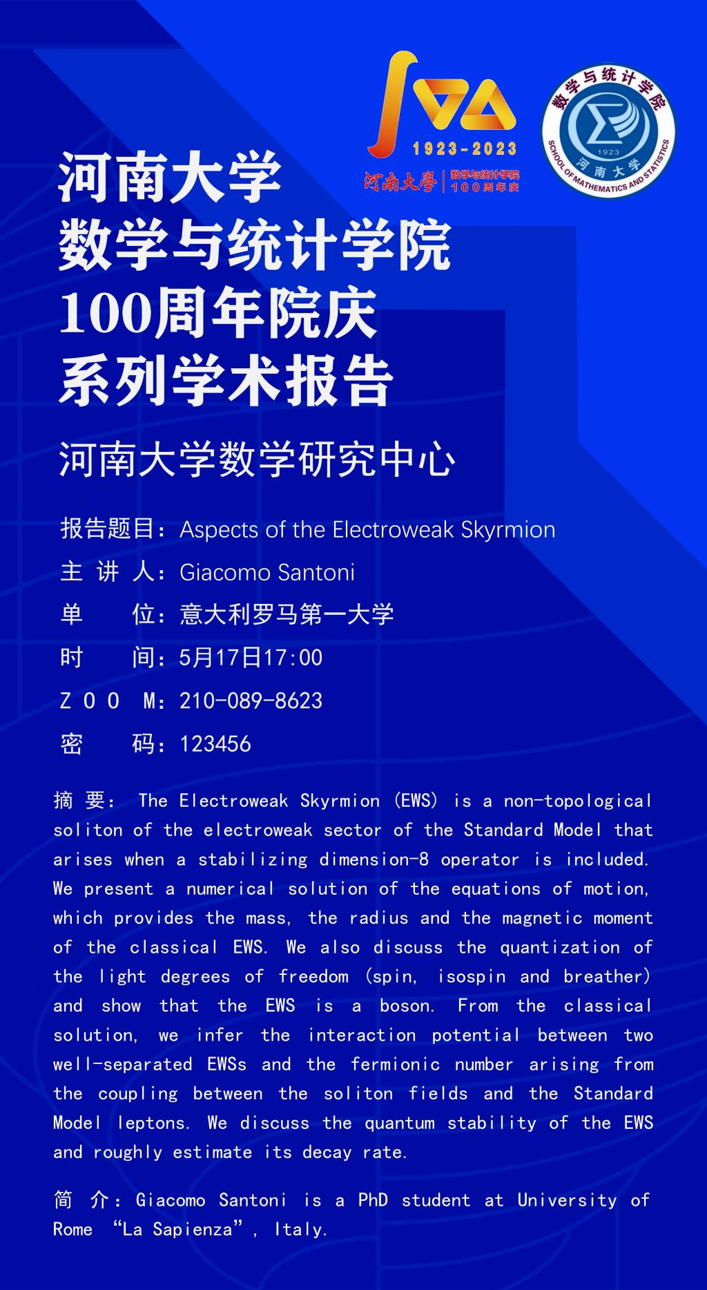 Giacomo Santoni:Aspects of the Electroweak Skyrmion(时间:5.17)