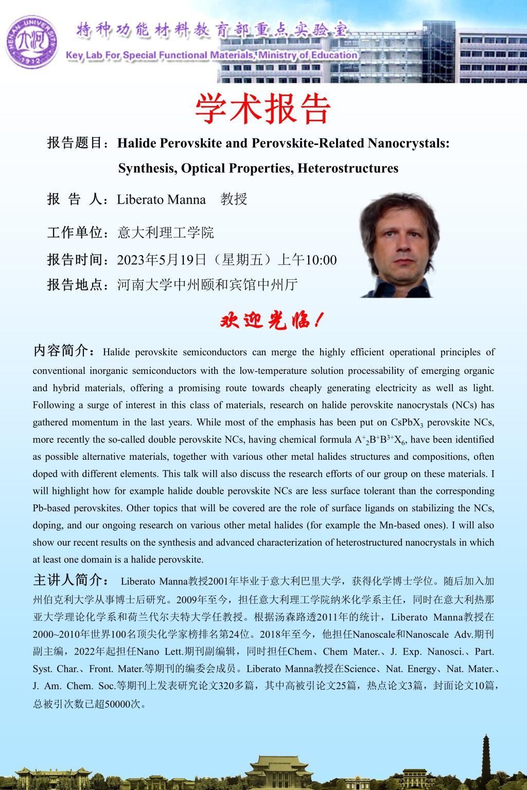 Liberato Manna: Halide Perovskite and Perovskite-Related Nanocrystals: Synthesis, Optical Properties, Heterostructures(时间5.19上午10:00)