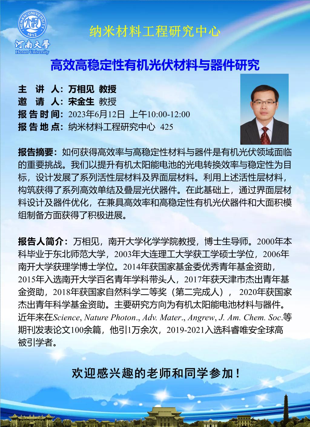 纳米材料工程研究中心:分子沙漏、高效高稳定性有机光伏材料与器件研究(时间6.12)