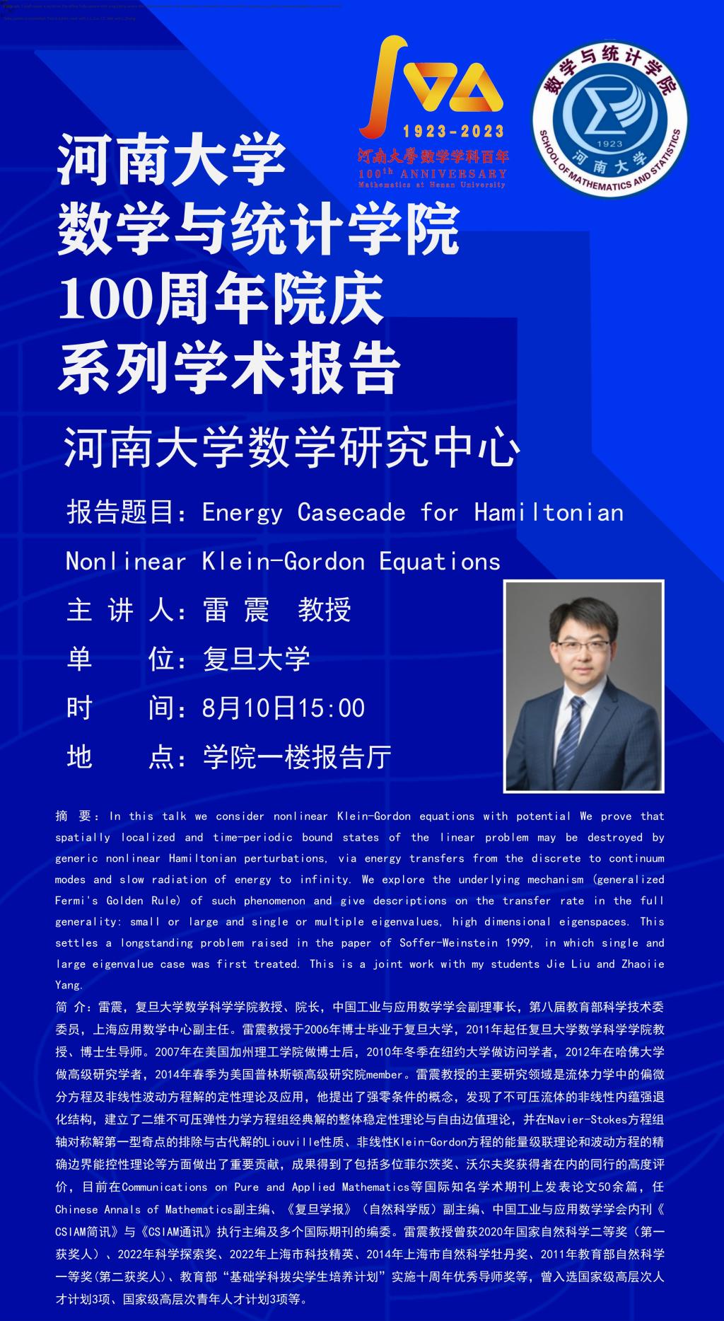 雷震:Energy Casecade for Hamiltonian Nonlinear Klein-Gordon Equations(时间:8.10)