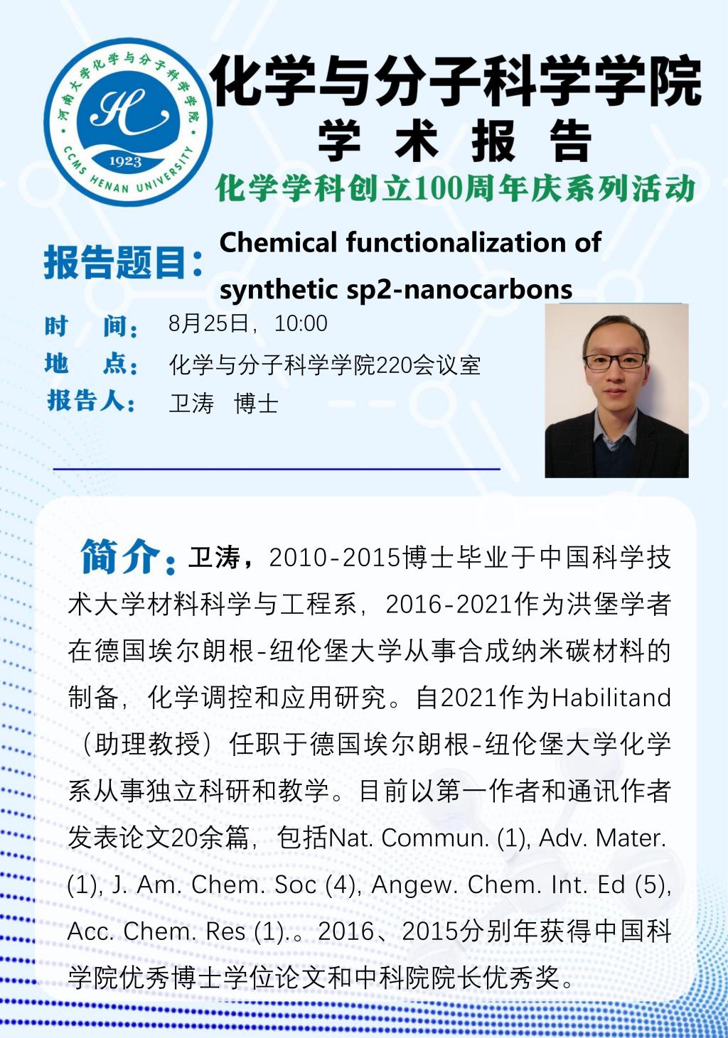 卫涛:Chemical functionalization of synthetic sp2-nanocarbons(时间8.25)