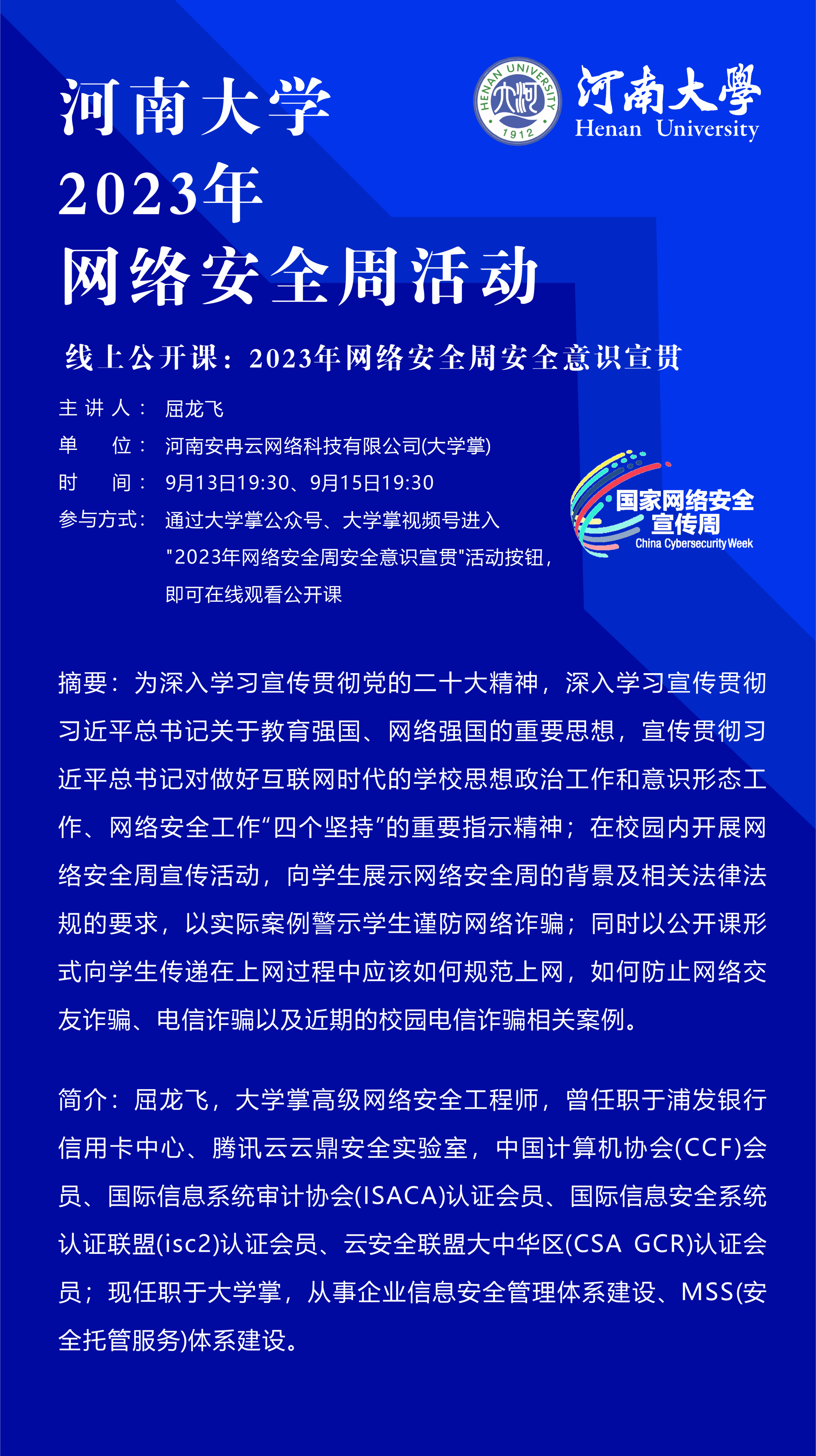 屈龙飞:2023年网络安全周安全意识宣讲(时间:9月13日、9月15日)