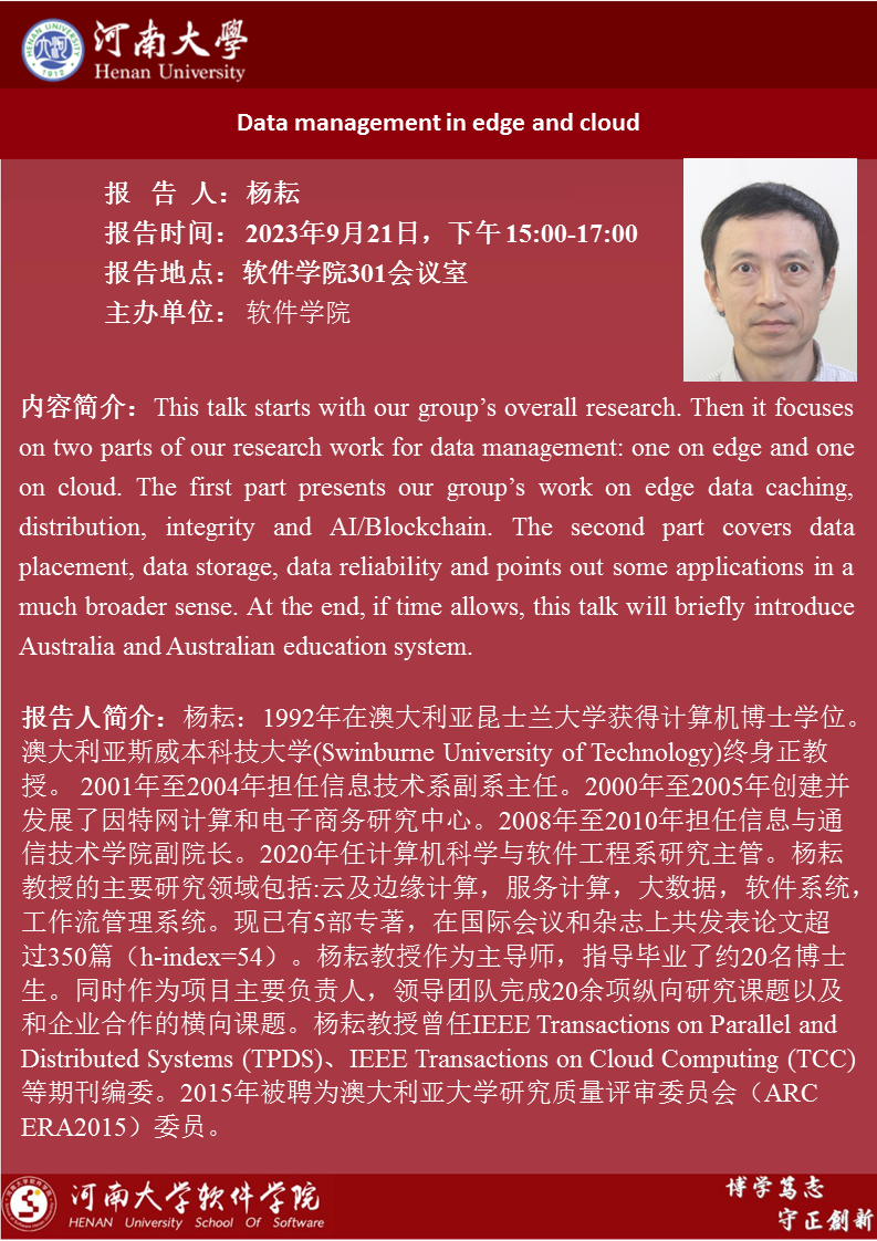杨耘:Data management in edge and cloud(时间:09月21日)