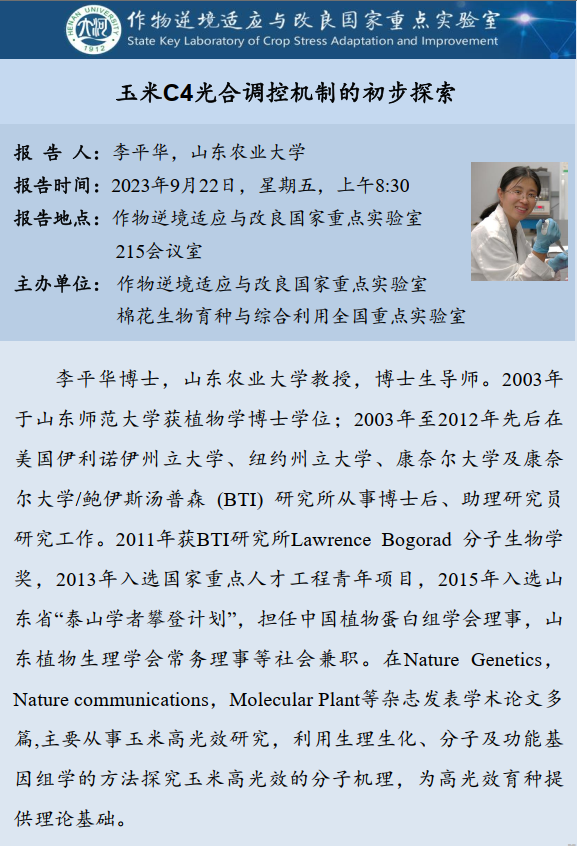 李平华:玉米C4光合调控机制的初步探索(时间:9月22日)