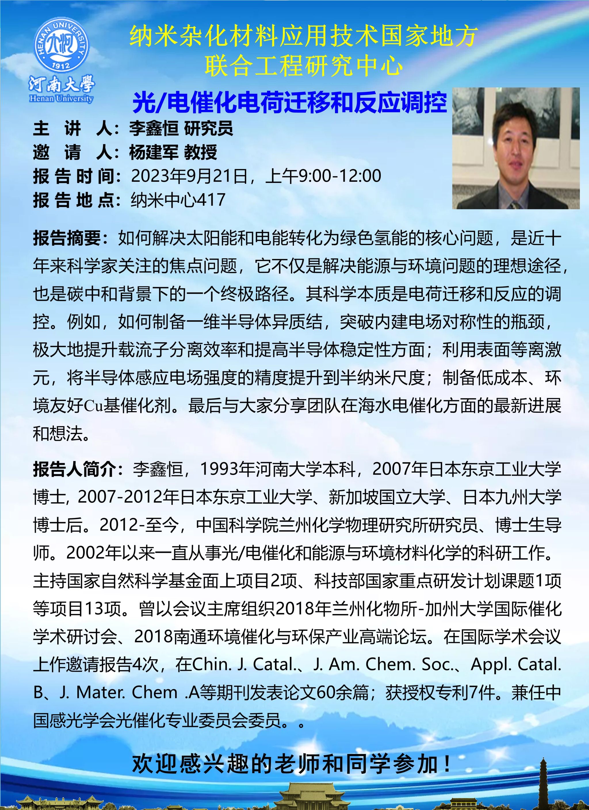 李鑫恒:光/电催化电荷迁移和反应调控(时间:9月21日)