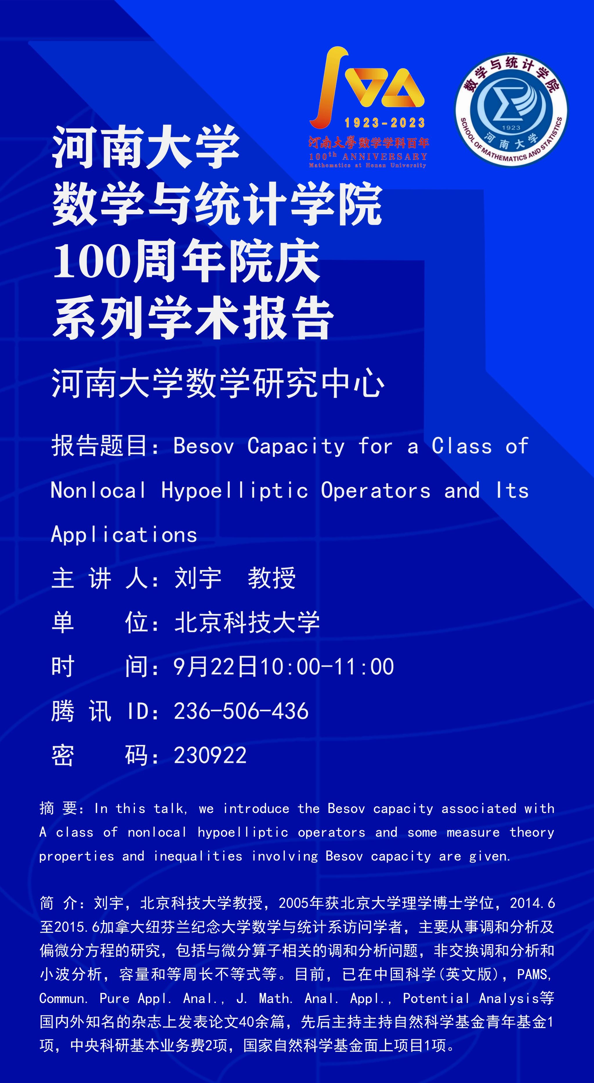 刘宇:Besov Capacity for a Class of Nonlocal Hypoelliptic Operators and Its Applications(时间:9.22)