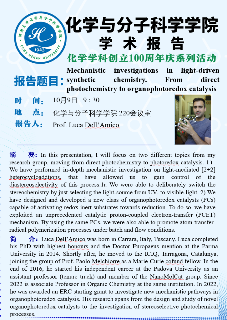 Prof. Luca Dell’Amico 报告题目:Mechanistic investigations in light-driven synthetic chemistry. From direct photochemistry to organophotoredox catalysis(时间:10月9日)