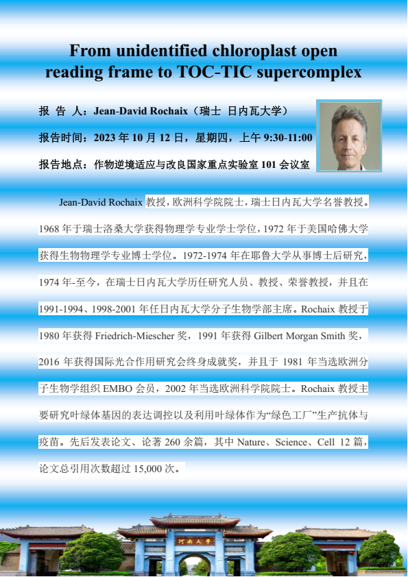 Jean-David Rochaix:From unidentified chloroplast openreading frame to TOC-TIC supercomplex(时间:10月12日)