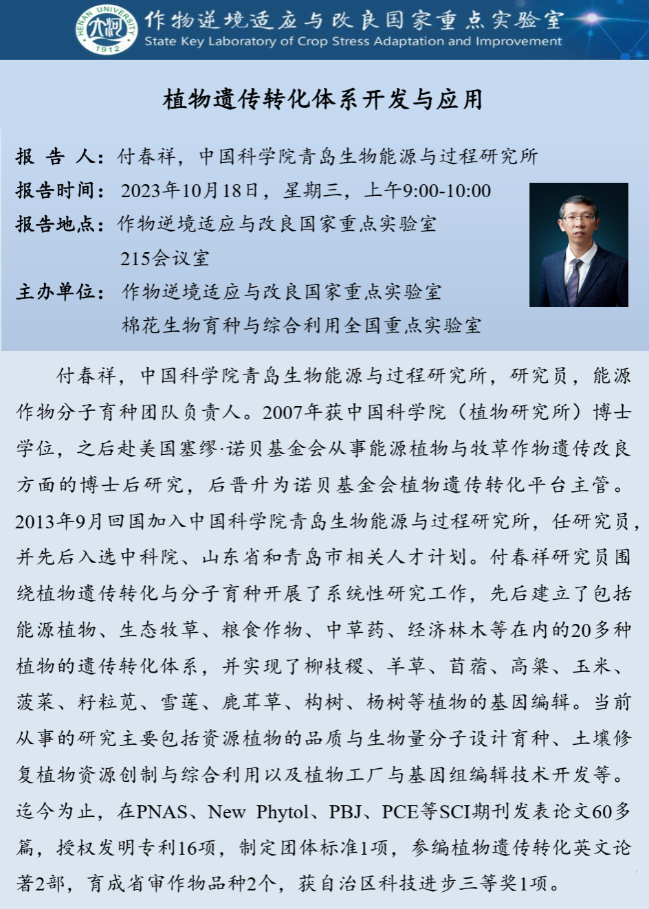 付春祥:植物遗传转化体系开发与应用(时间:10月18日)