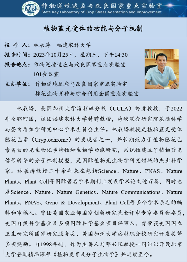 林辰涛:植物蓝光受体的功能与分子机制(时间:10月25日)