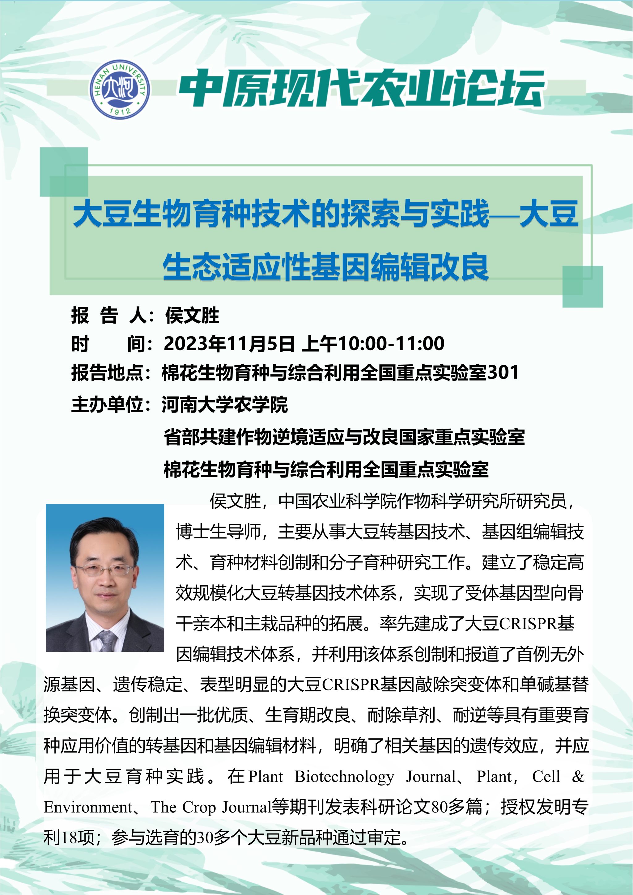 侯文胜:大豆生物育种技术的探索与实践一大豆生态适应性基因编辑改良(时间:11月5日)
