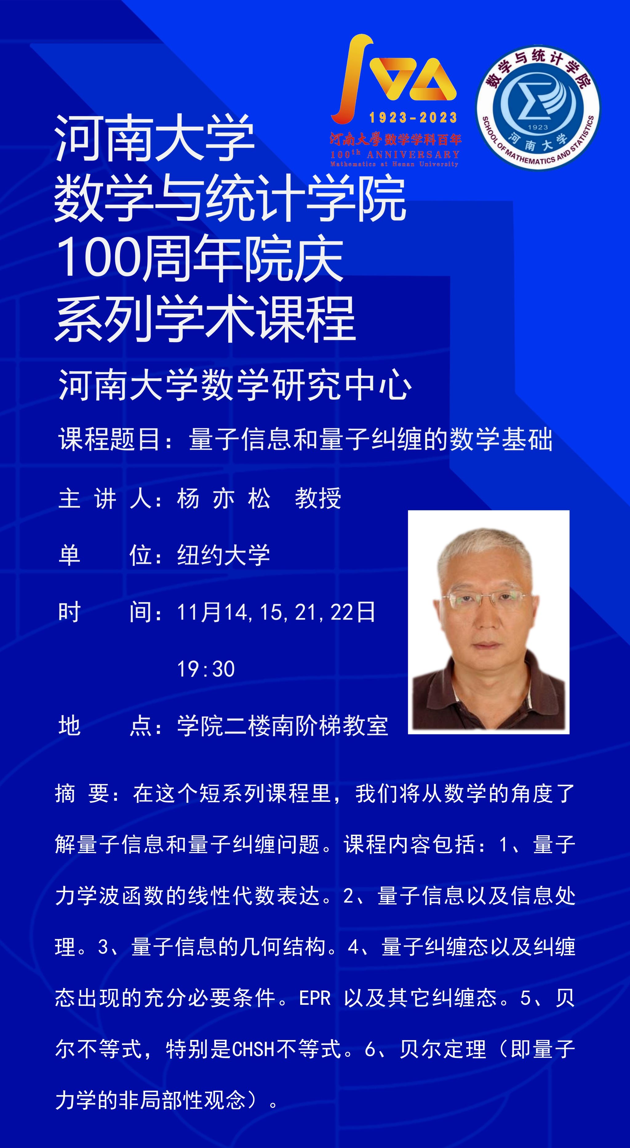杨亦松:量子信息和量子纠缠的数学基础(时间:11月14,15,21,22日)
