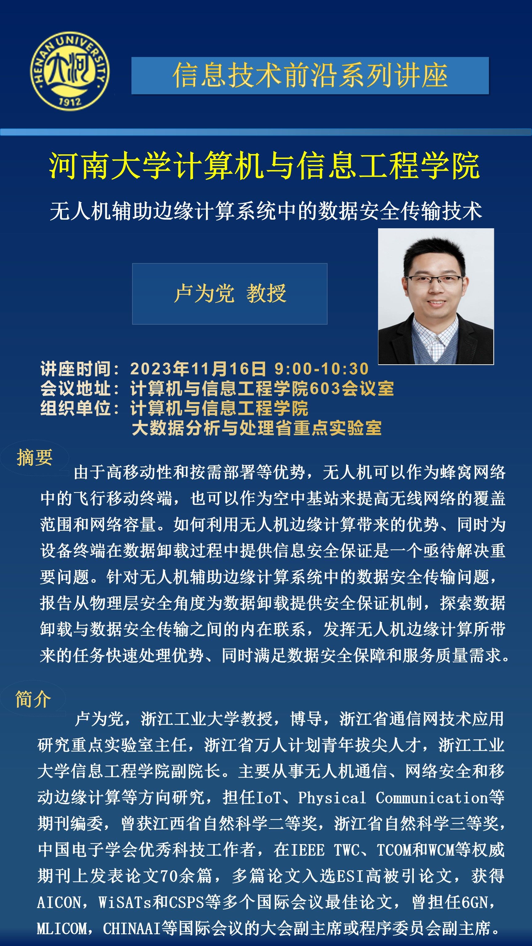 卢为党:无人机辅助边缘计算系统中的数据安全传输技术(时间:2023年11月16日)
