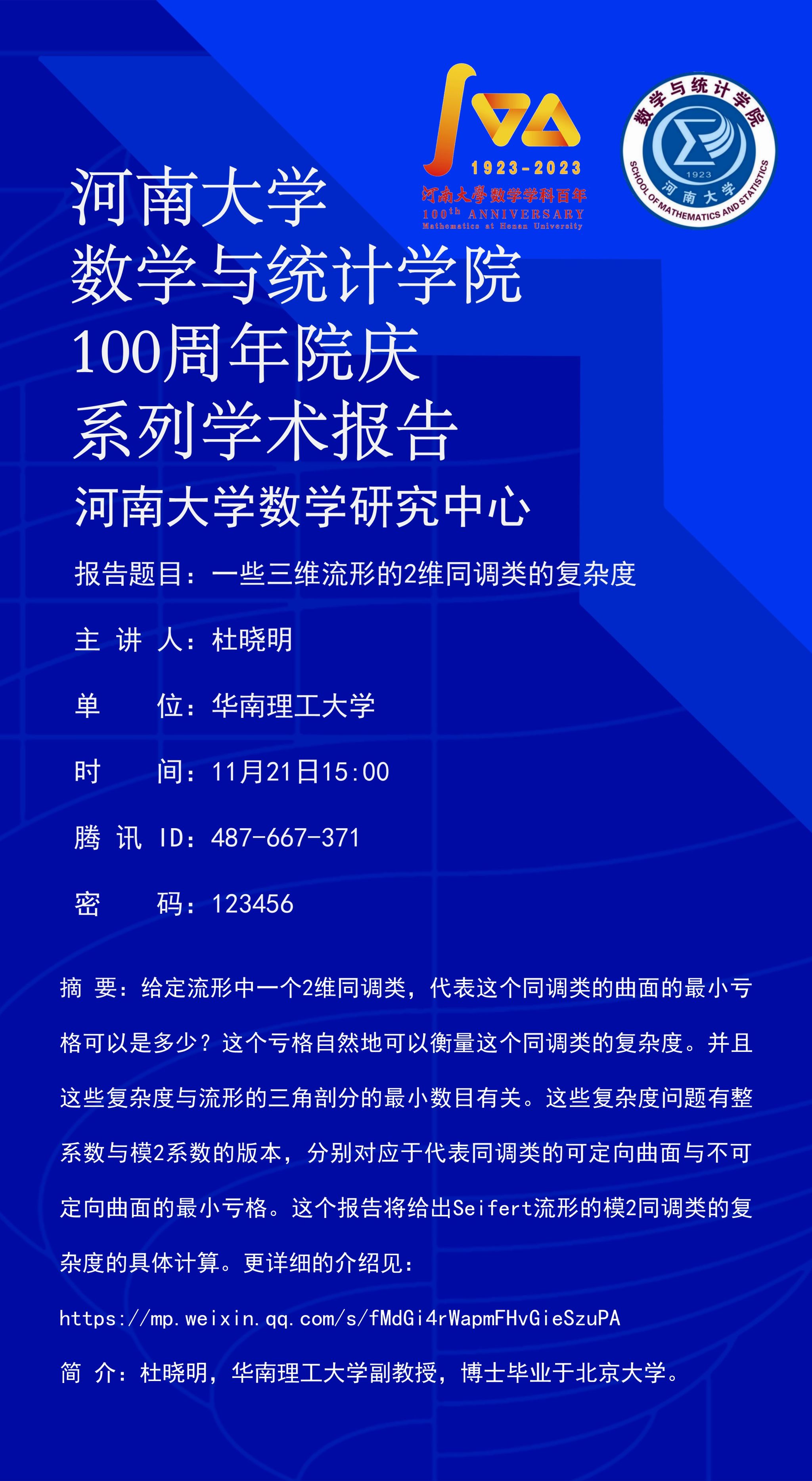 杜晓明:一些三维流形的2维同调类的复杂度(时间:11.21)