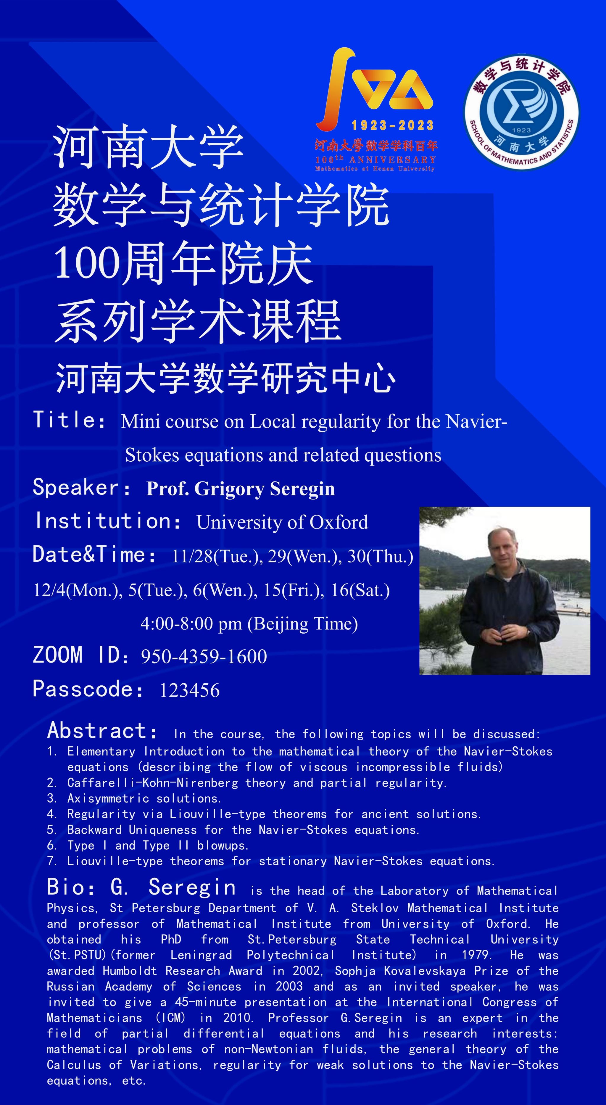 Grigory Seregin:Mini course on Local regularity for the Navier-Stokes equations and related questions(时间:12.15)
