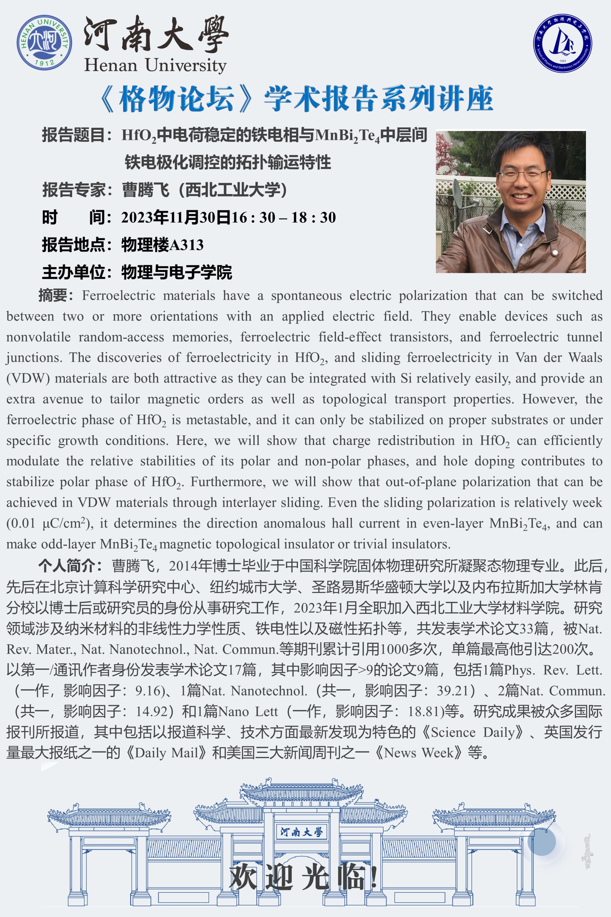 曹腾飞:HfO2中电荷稳定的铁电相与MnBi2Te4中层间铁电极化调控的拓扑输运特性(时间:11月30日)