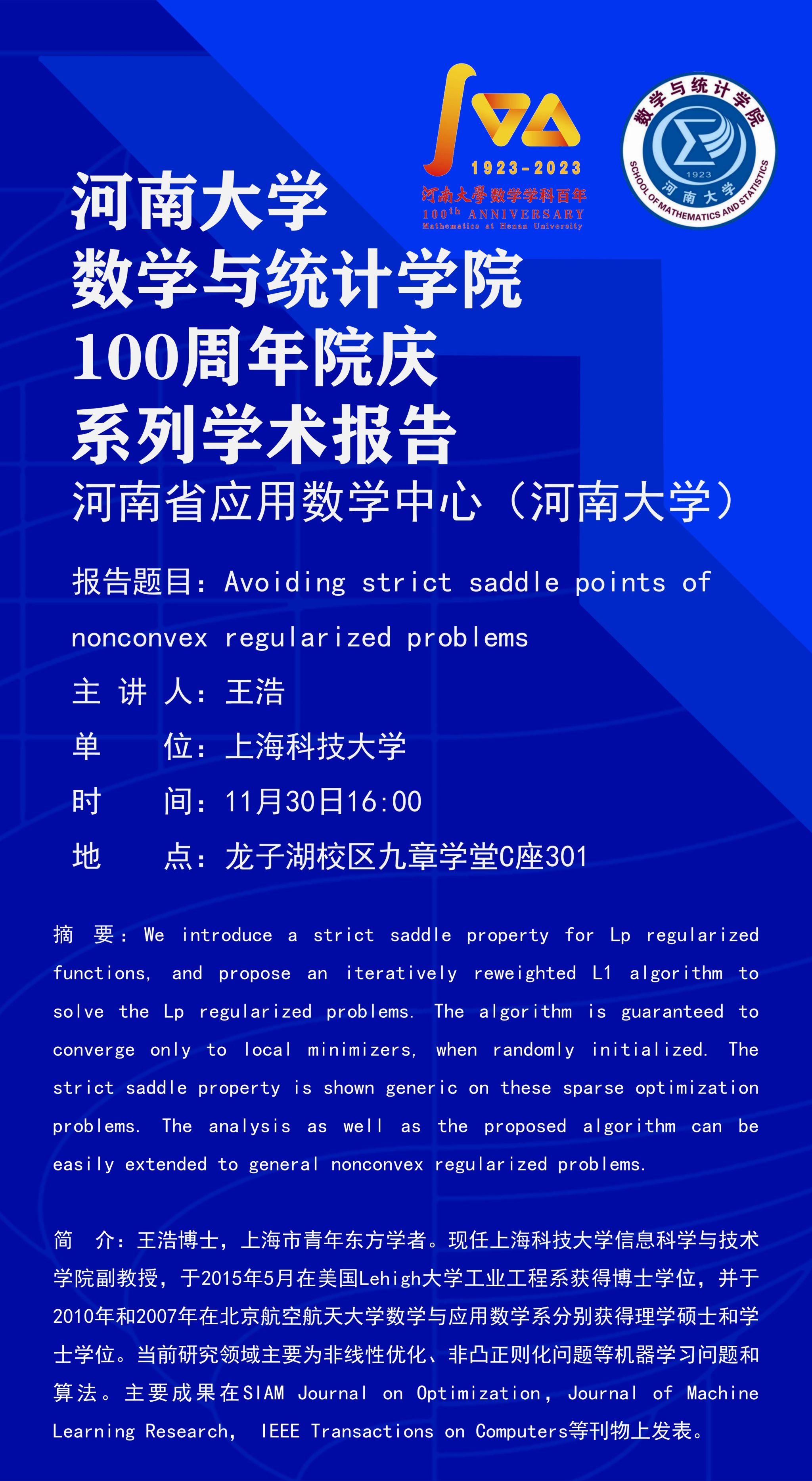 王浩: Avoiding strict saddle points of nonconvex regularized problems(时间:11.30)