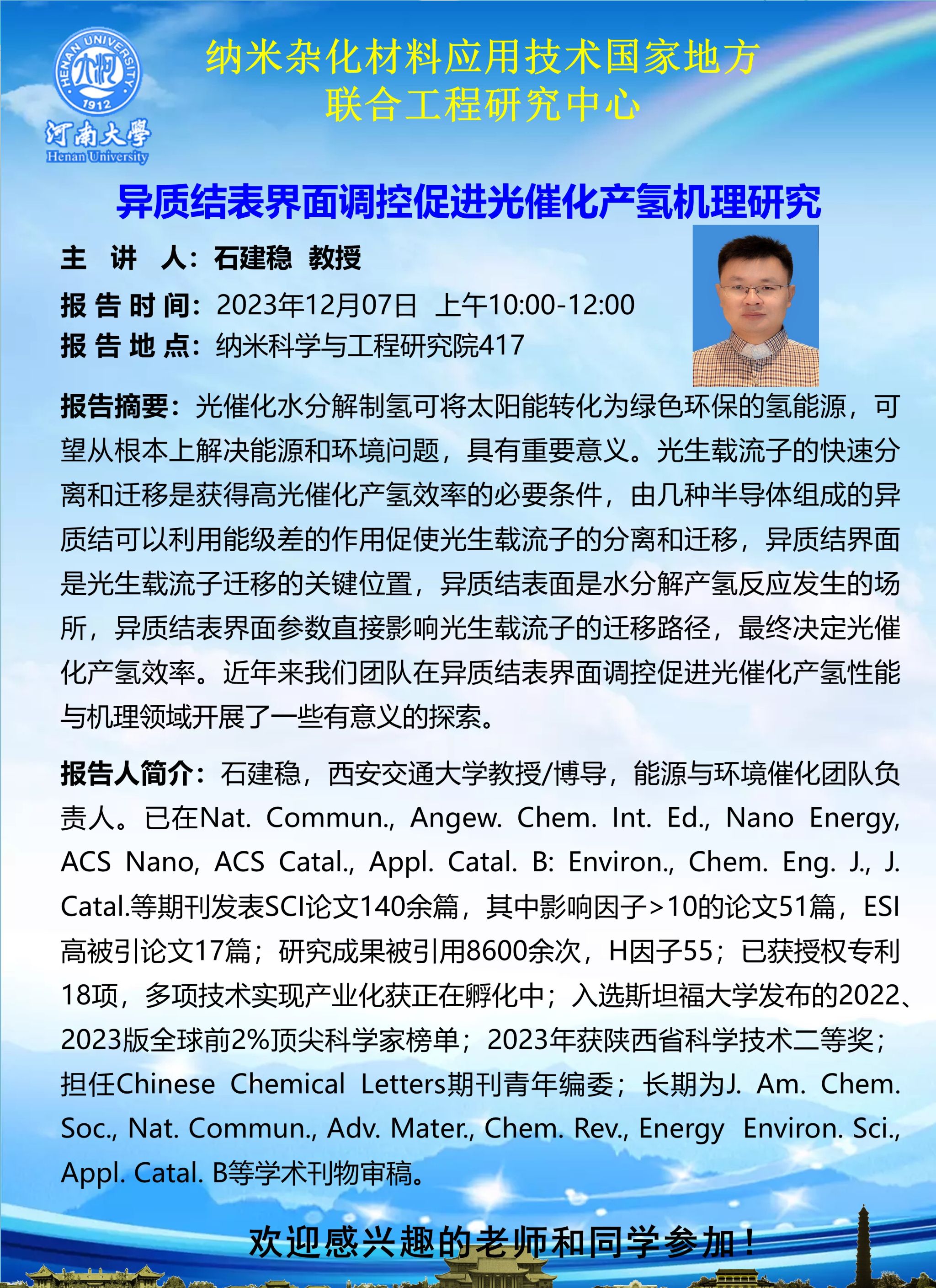 石建稳:异质结表界面调控促进光催化产氢机理研究(时间:12月7日)