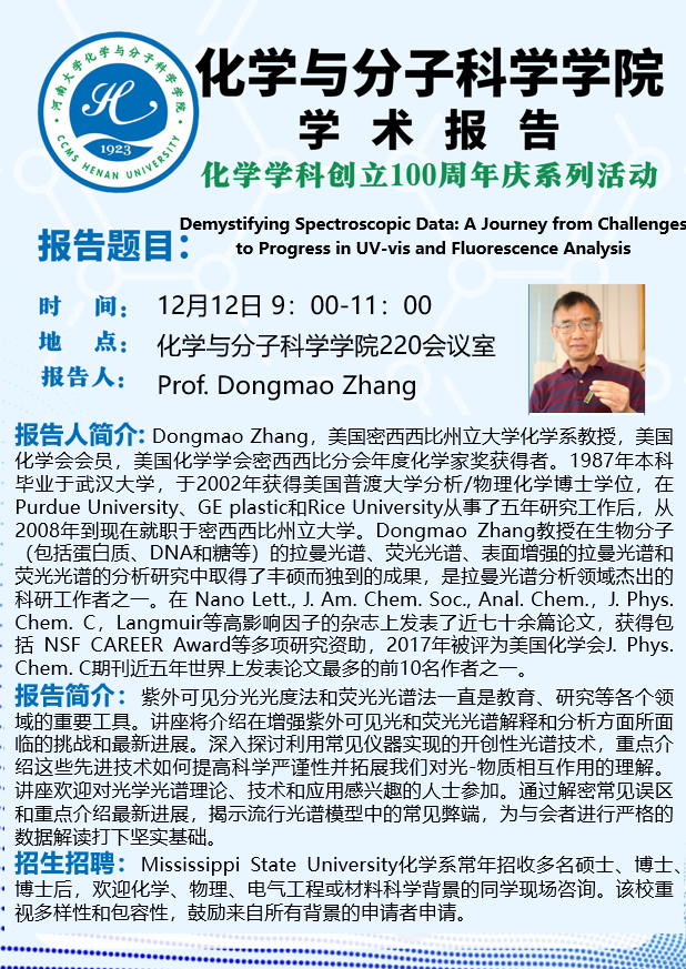 Dongmao Zhang:Demystifying Spectroscopic Data: A Journey from Challenges to Progress in UV-vis and Fluorescence Analysis(时间:12月12日)