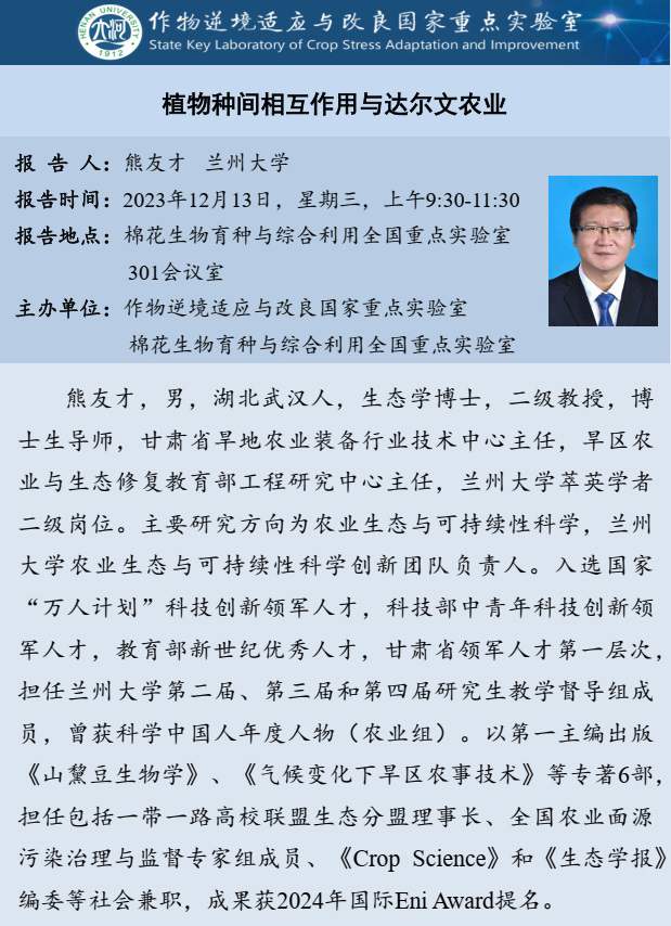 熊友才:植物种间相互作用与达尔文农业(时间:12月13日)