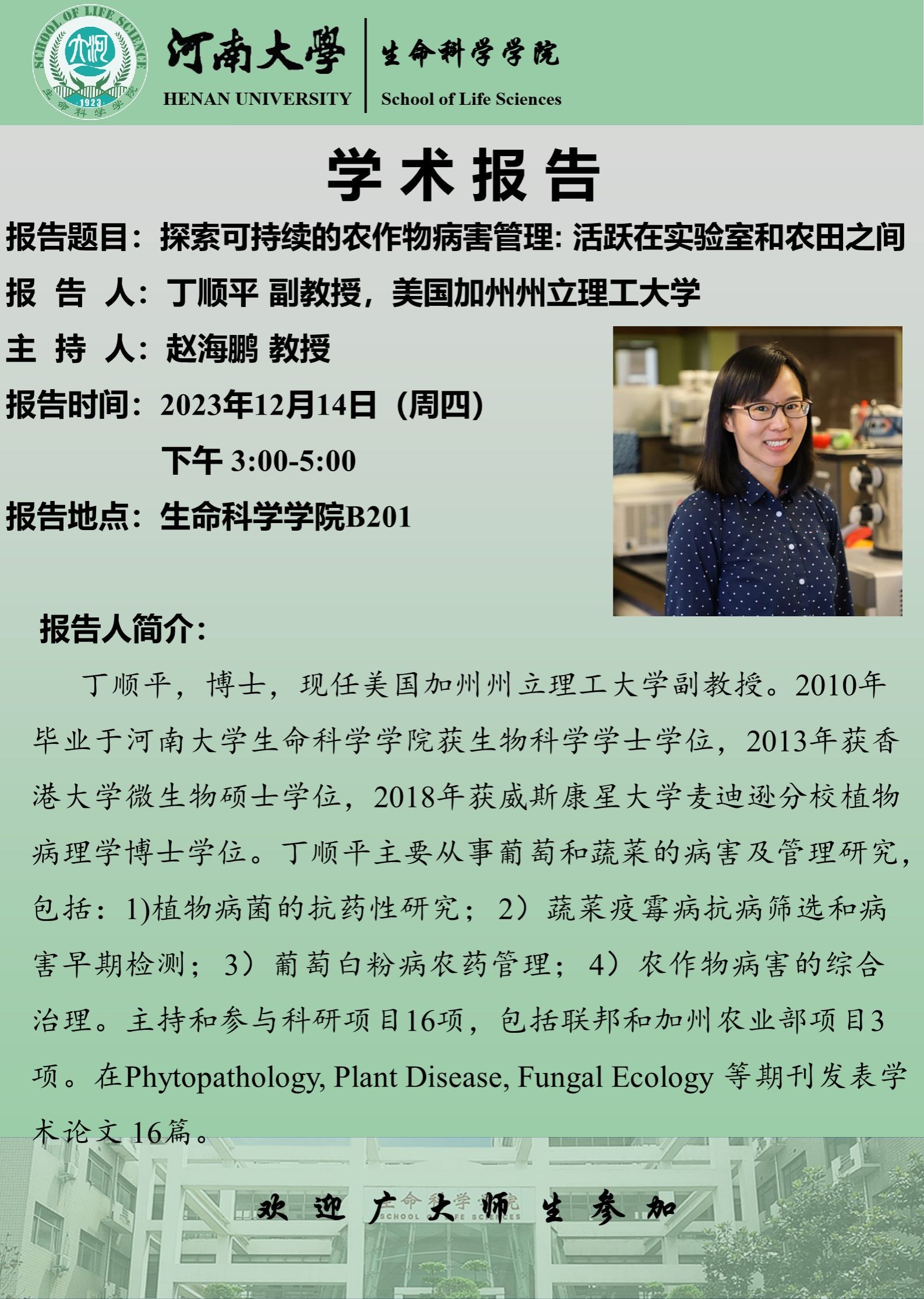 丁顺平:探索可持续的农作物病害管理: 活跃在实验室和农田之间(时间:12月14日)
