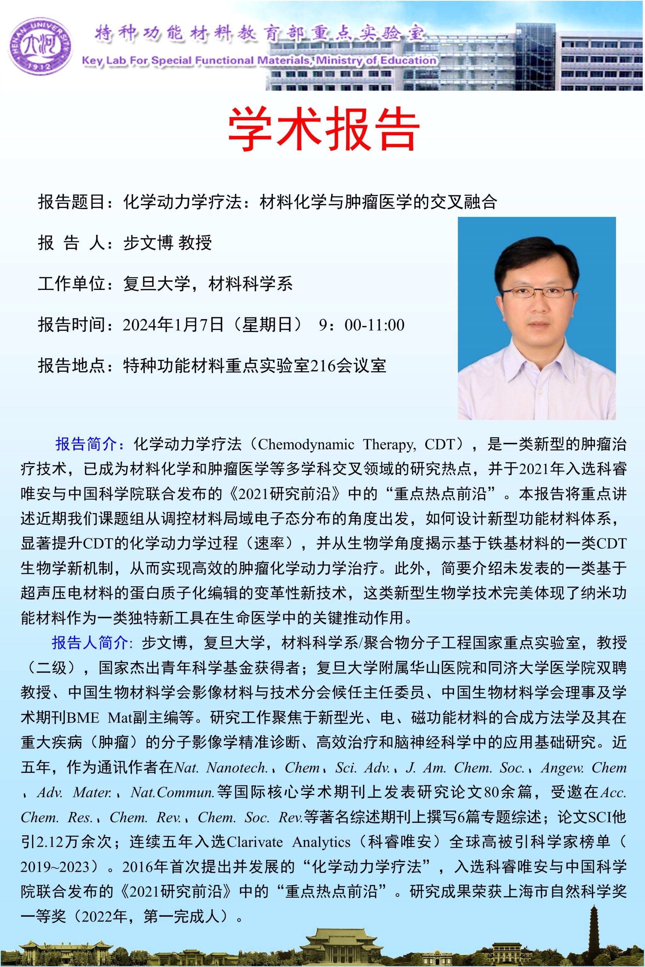 步文博:化学动力学疗法-材料化学与肿瘤医学的交叉融合(1月7日)