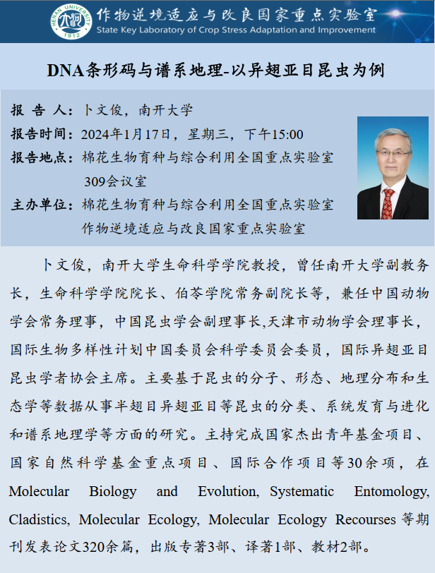 卜文俊:DNA条形码与谱系地理-以异翅亚目昆虫为例(1月17日)