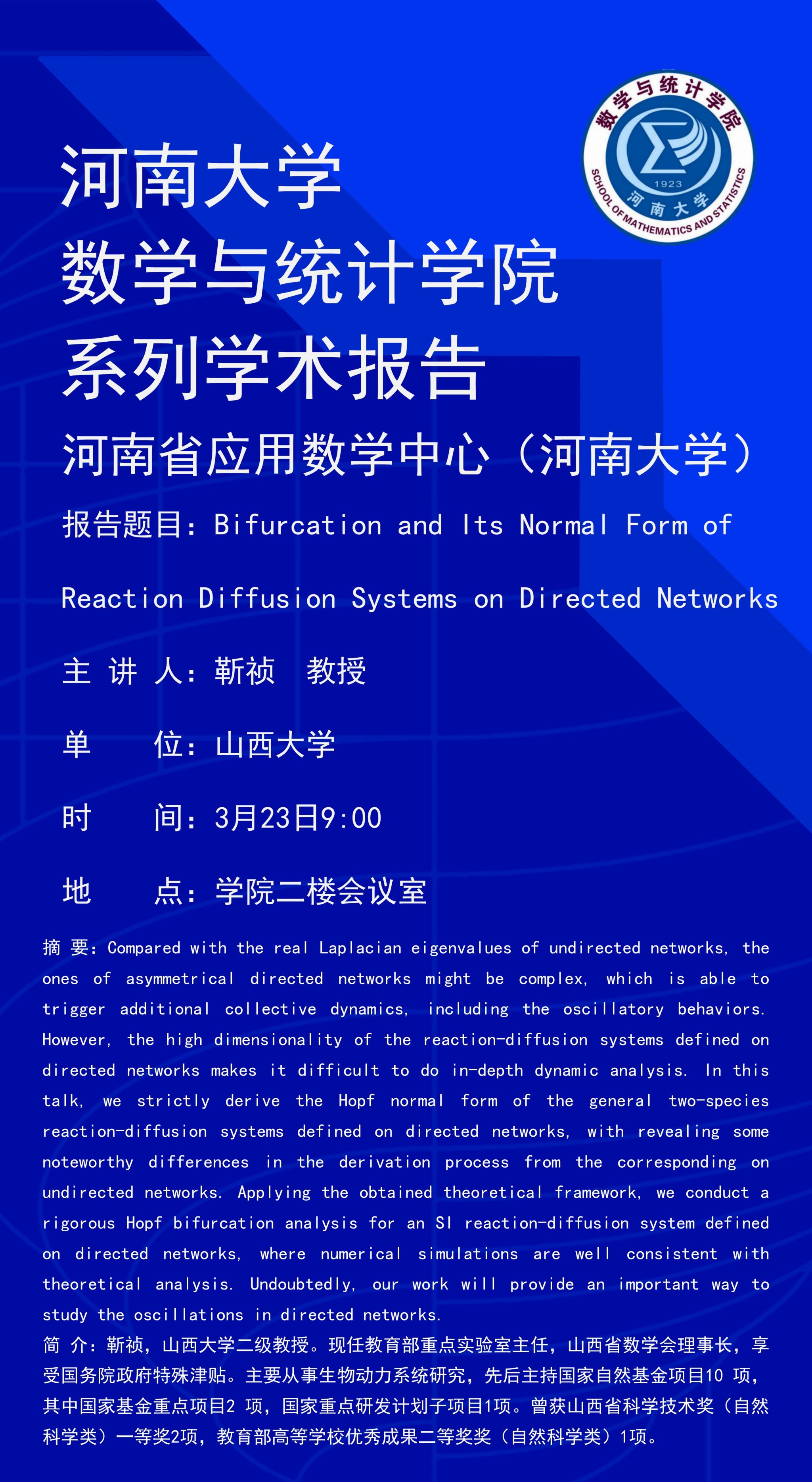靳祯:Bifurcation and Its Normal Form of Reaction Diffusion Systems on Directed Networks(时间:3.23)