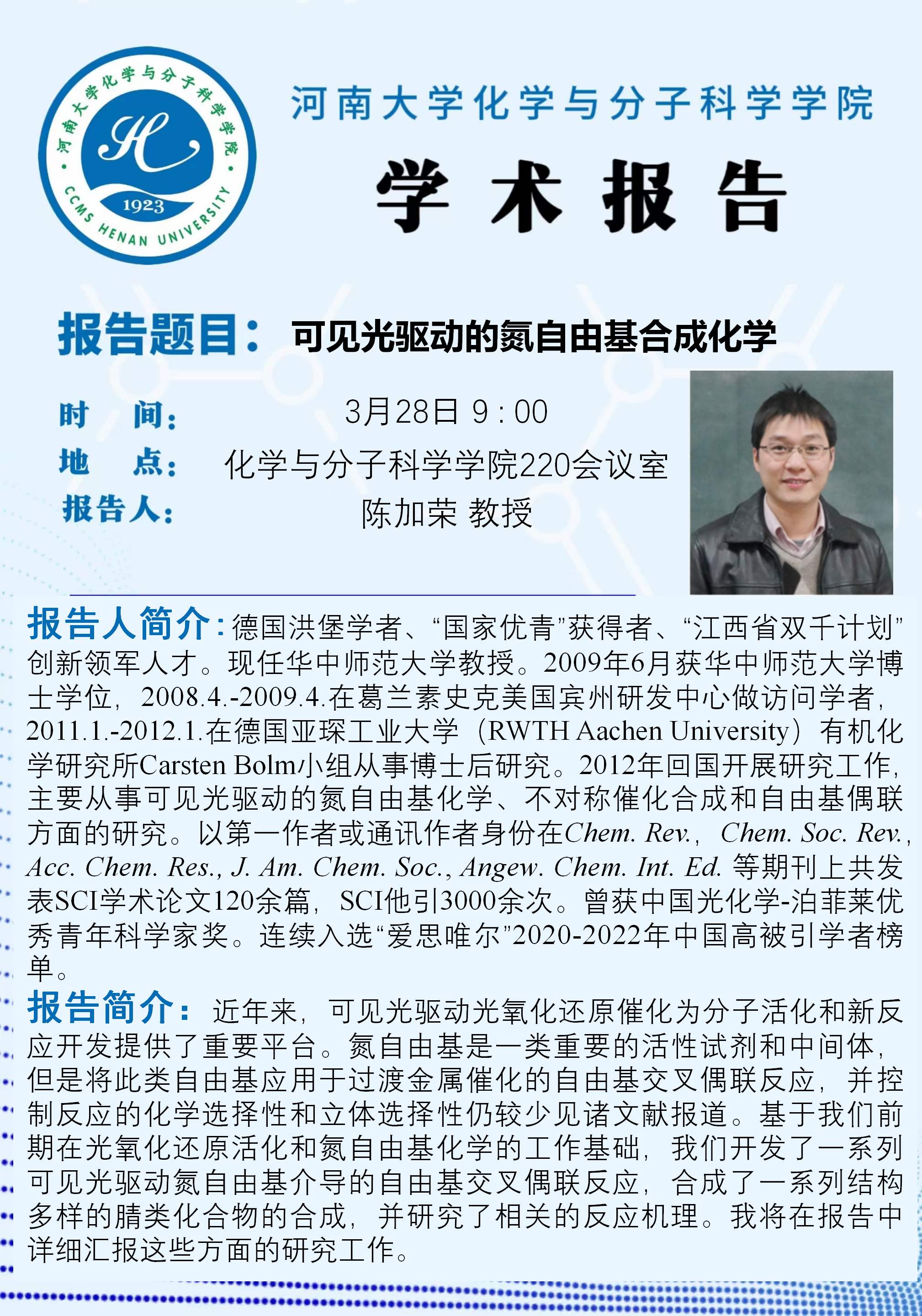 陈加荣:可见光驱动的氮自由基合成化学(时间:3月28日)