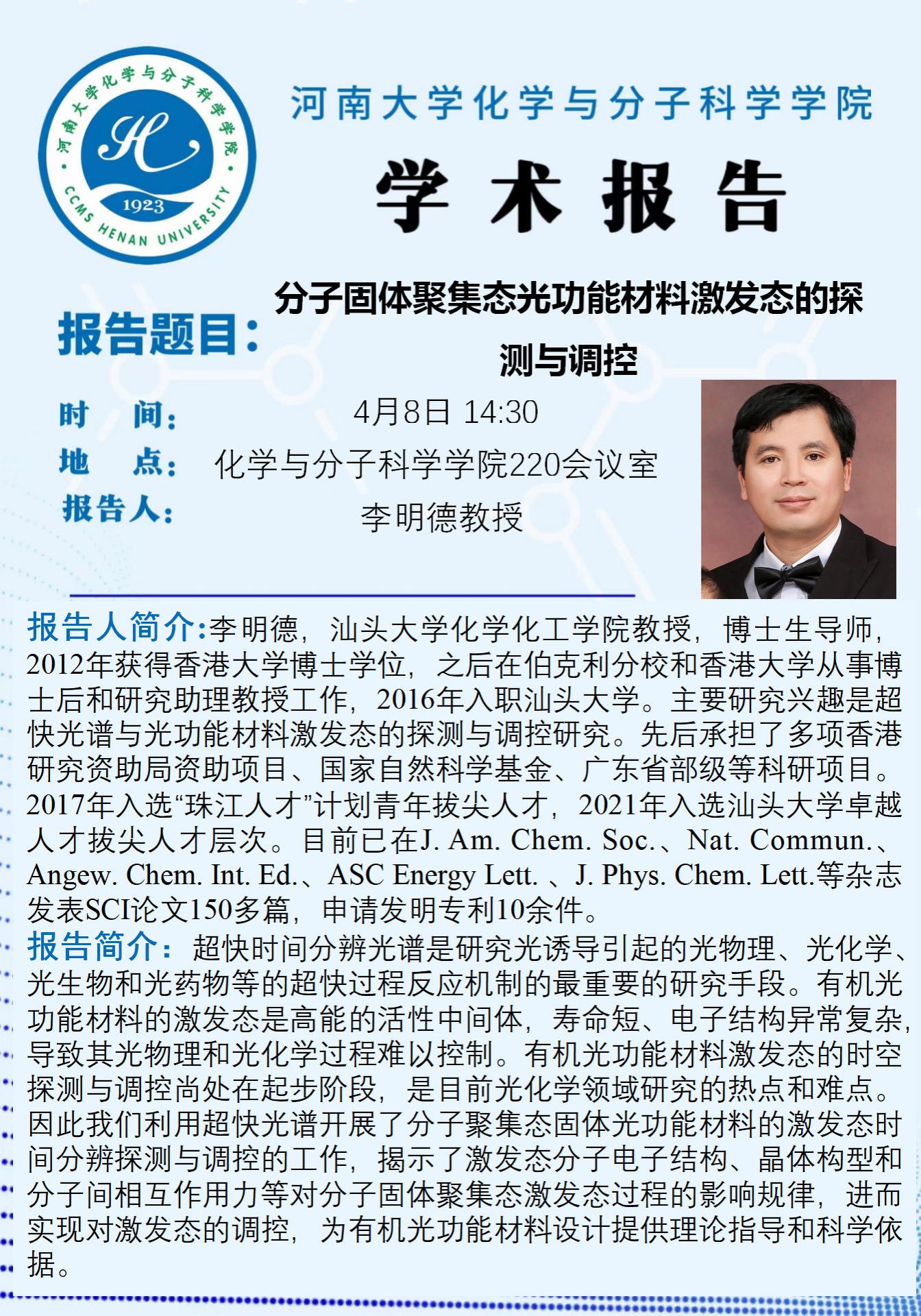 李明德:分子固体聚集态光功能材料激发态的探测与调控 (时间:04月08日)