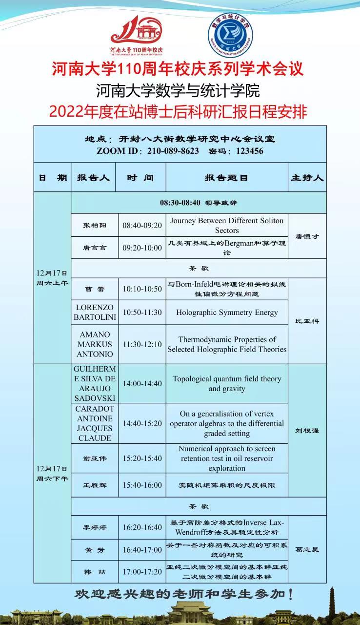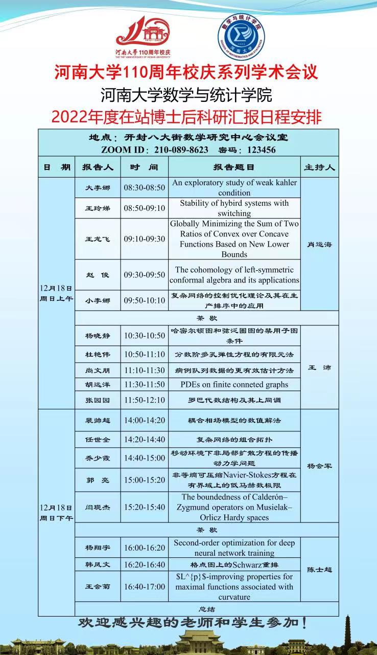 数学与统计学院2022年度在站博士后科研汇报会议日程安排(时间:12.17-12.18)